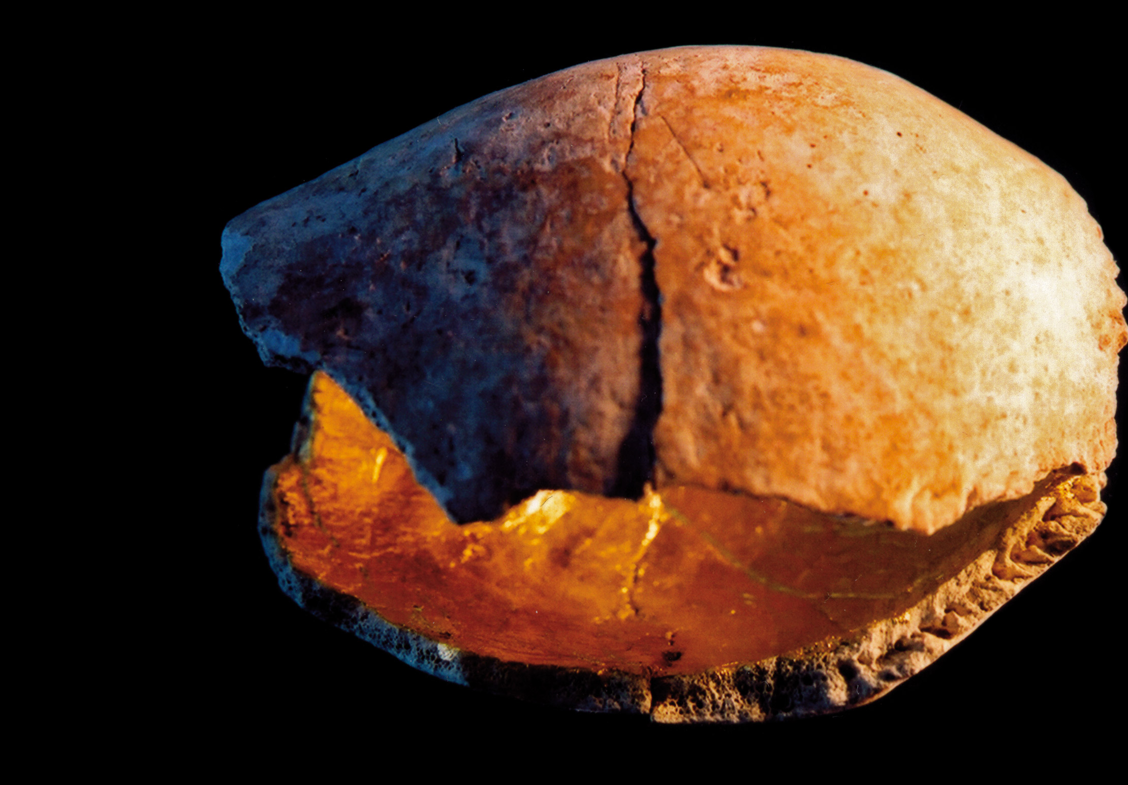 "Calotte de crâne humain, feuilles d’or, miroir."