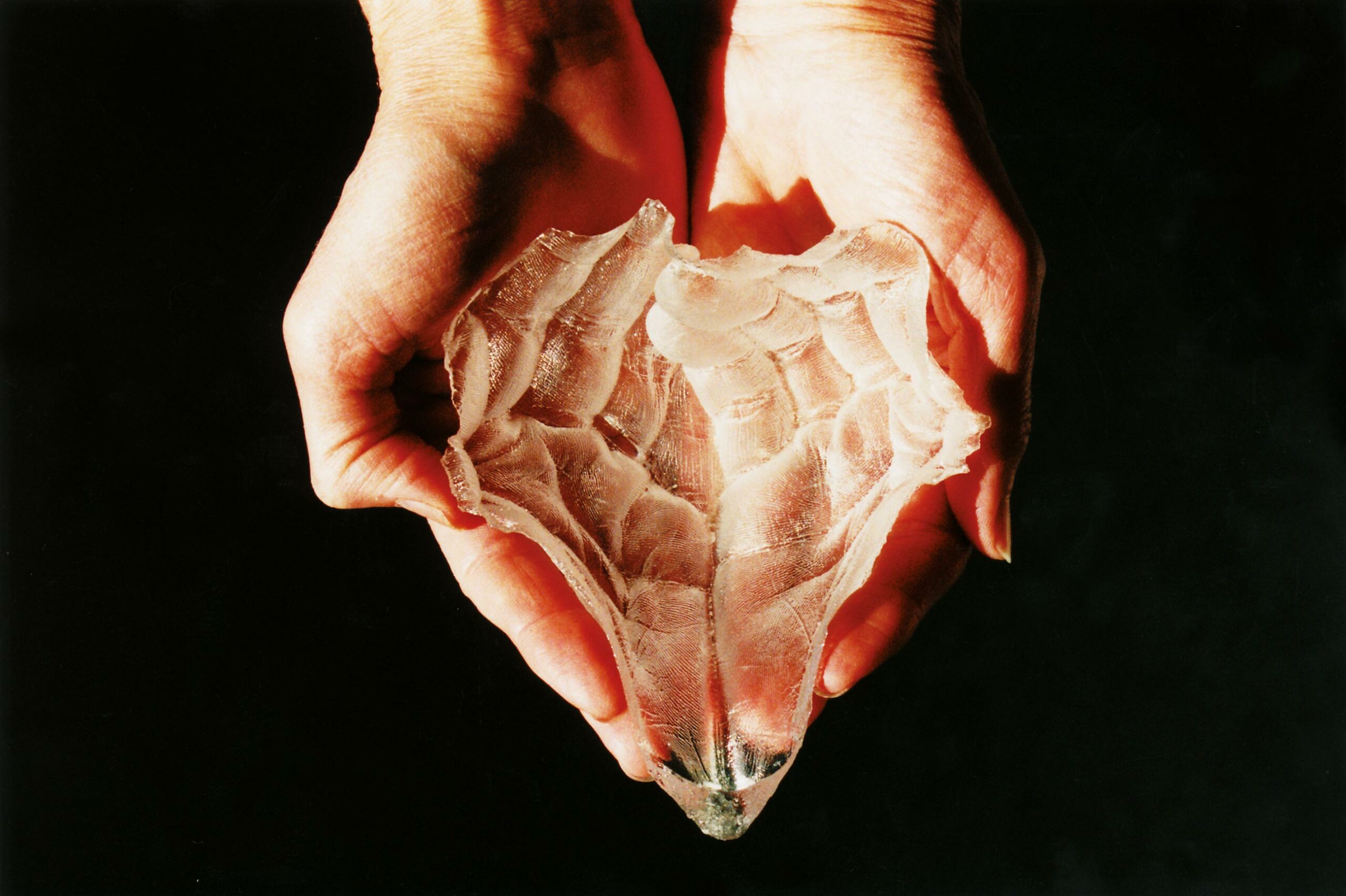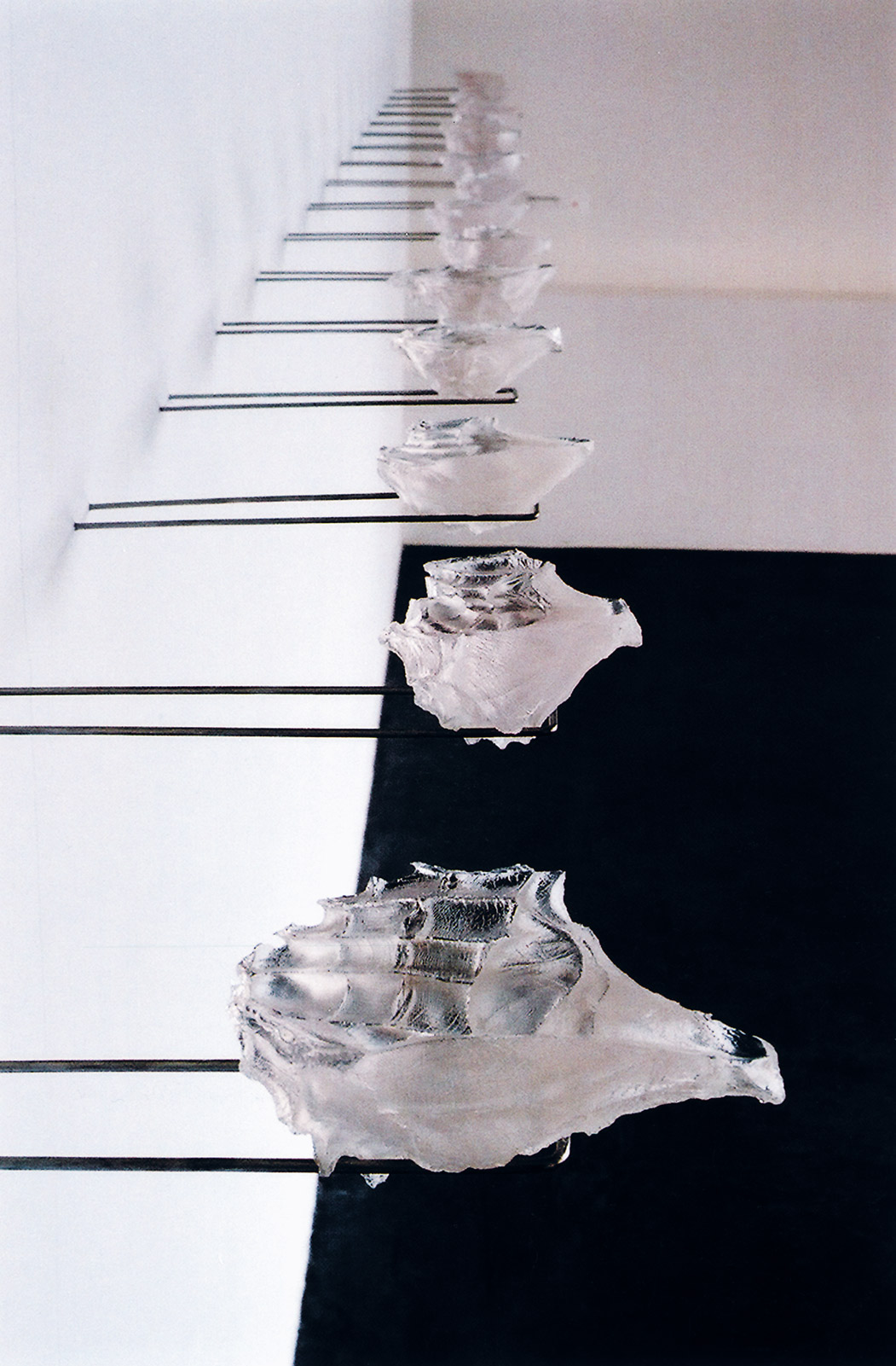 La transparence, la plénitude, les reflets et brillances font croire, au premier abord, que ces moulages recueillent de l’eau. Mais c’est un faux liquide constitué d’un vrai solide : la résine, semblable à de l’eau gelée.