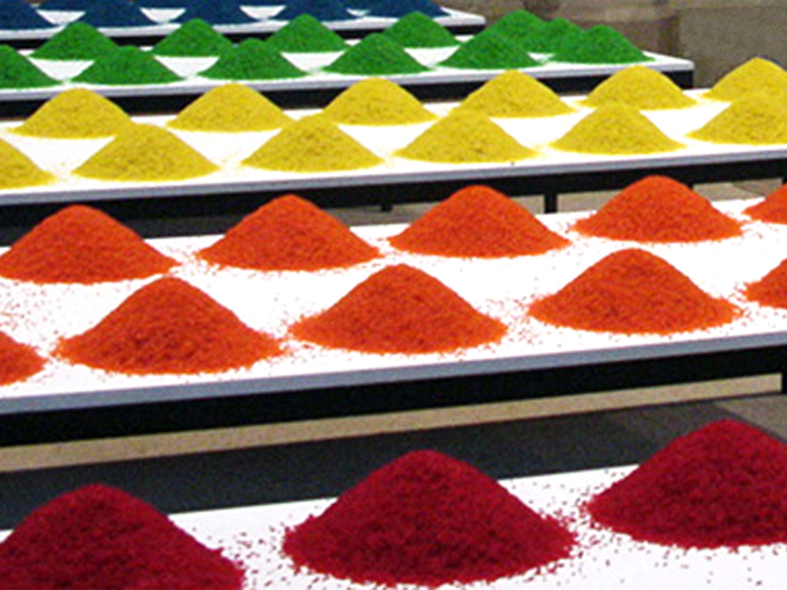 Il s’agit d’une installation sculpturale : un agencement formel conique. Chaque cône incarne une couleur saturée. S’approchant de ces amas de couleurs, le regard, attisé de curiosité, construit un rapport formel avant de découvrir le matériau de la sculpture : des amoncellements de riz teinté. Le titre nous informe qu’il s’agit de colorants comestibles.