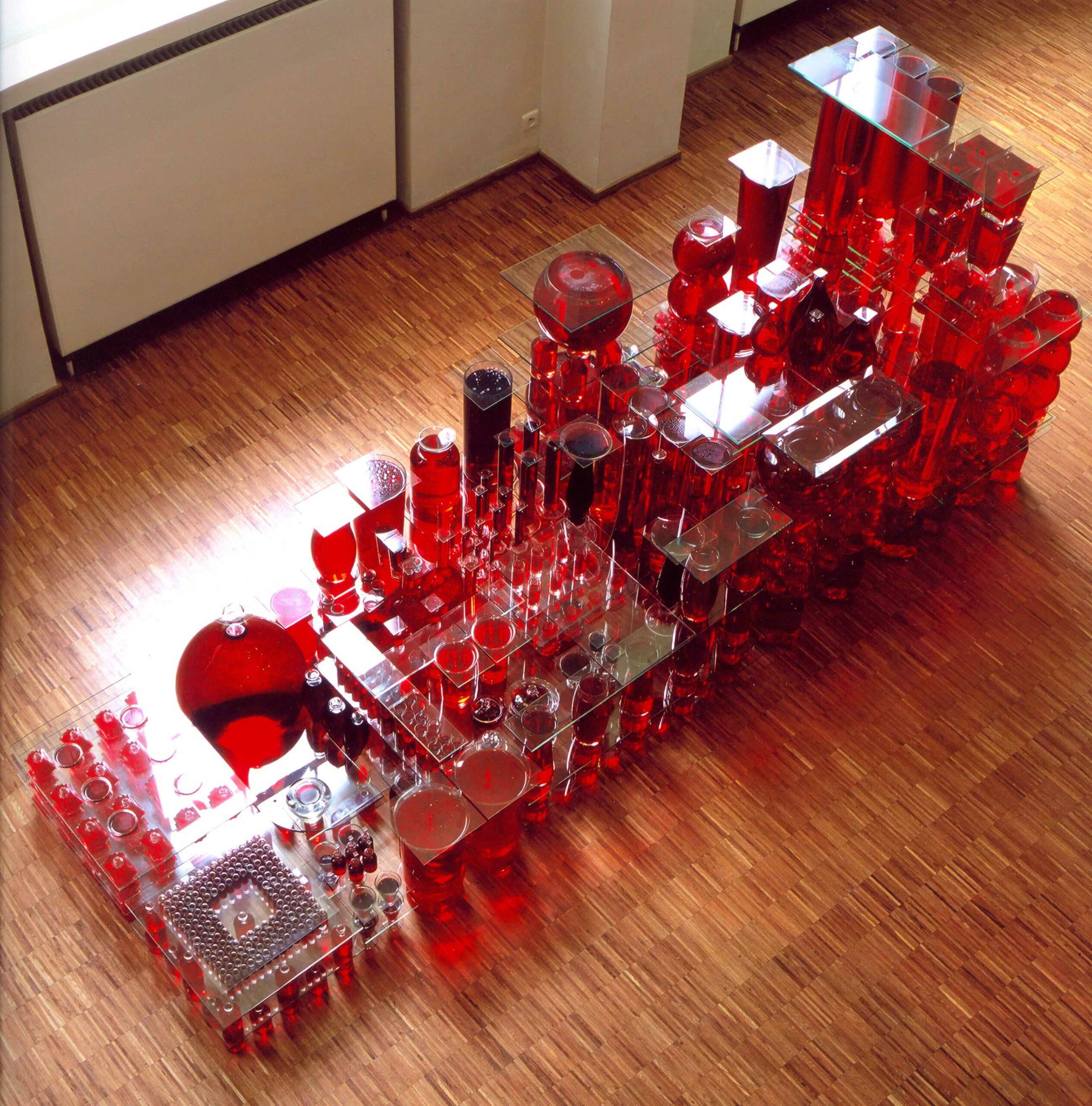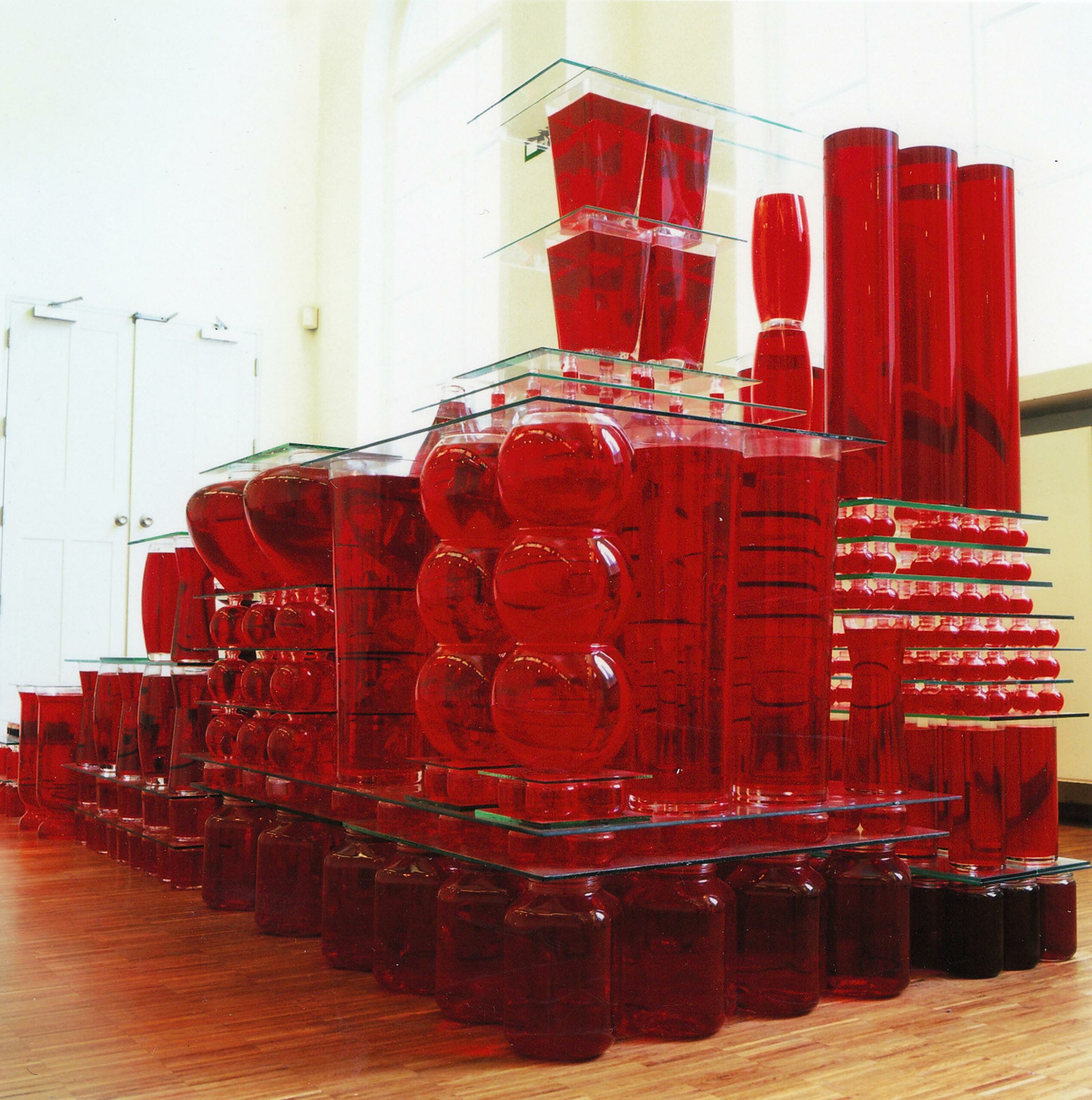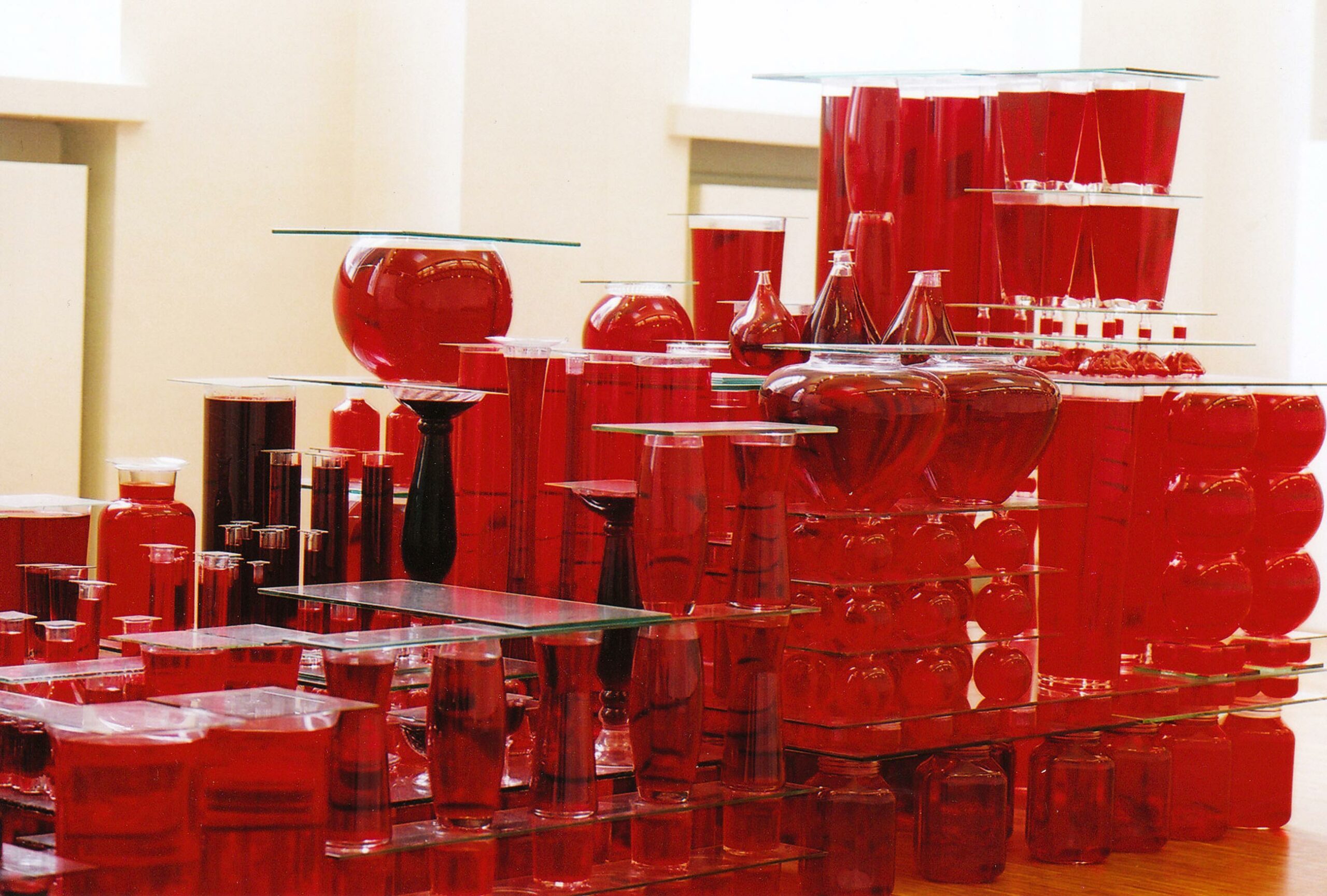 Les verreries forment une architecture d’apparence précaire, fragile où chaque récipient semble indispensable à la stabilité d’un autre. Ces derniers, du plus petit au plus grand, sont remplis d’un liquide rouge aux différentes tonalités.
